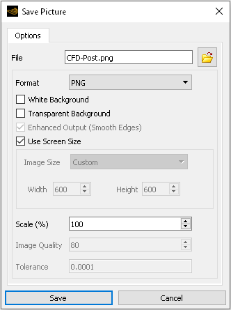 Note: GPU rendering is required to support transparent backgrounds. In the user interface, ensure that the Use GPU Rendering for Printing option is selected (restart the application after changing that option). For details, see Viewer Setup. If playing a session file in batch mode to save PNG images, run CFD-Post with GPU rendering enabled. For details, see Optional Command Line Arguments.