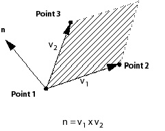 The normal vector to the plane is calculated using the right-hand rule. The first vector is from Point 1 to Point 2, and the second is from Point 1 to Point 3, as shown in the following diagram. For example, the direction of this vector might be important if you are using the plane to define a Clip Plane.