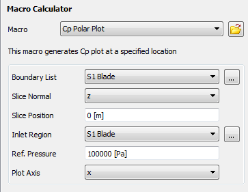 The Cp Polar macro produces a polar plot of the pressure coefficient (Cp) along a polyline. The macro creates the polyline using the Boundary Intersection method. For details, see Polyline Command. The boundary and intersecting slice plane are defined in the Macro Calculator and passed to the subroutine as arguments. The boundaries selected for Boundary List in the Macro Calculator make up one surface for the intersection. The second surface is a slice plane created using the X, Y, or Z normal axis to the plane (Slice Normal) and a point on that axis (Slice Position).