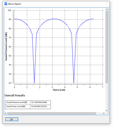The Fan Noise macro outputs a report; to view it, click . The report displays the input values, the sound pressure levels, the sound power levels, the directivity of harmonic 1, and the overall results. Here is a partial sample: