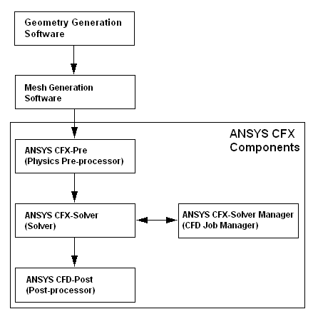 Ansys CFX consists of four software modules that take a geometry and mesh and pass the information required to perform a CFD analysis: