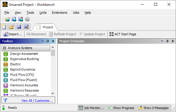 You begin by launching Ansys Workbench, which opens as an unsaved project and displays the available Analysis Systems.