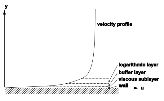 Experiments and mathematical analysis have shown that the near-wall region can be subdivided into three layers. In the innermost layer, the so-called viscous sublayer, the flow is laminar-like, and the (molecular) viscosity plays a dominant role in momentum and heat transfer. Further away from the wall, in the logarithmic layer, turbulence dominates the mixing process. Finally, there is a region between the viscous sublayer and the logarithmic layer called the buffer layer, where the effects of molecular viscosity and turbulence are of equal importance. The figure below illustrates these subdivisions of the near-wall region.