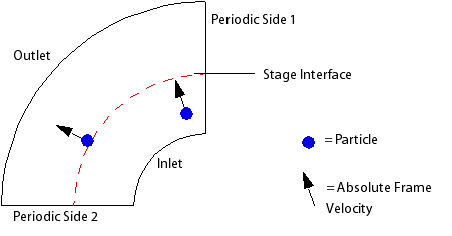When a particle crosses a stage interface, it enters the new domain at a random location and its velocity is rotated accordingly. This is in addition to change in the relative velocity that occurs due to the particle changing to a new frame of reference. This can be thought of as equivalent to the circumferential "averaging" that is performed for the fluid flow variables at stage interfaces. For details, see Stage (Mixing Plane).