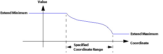 The Extend Min and Extend Max options enable you to increase the valid range of the interpolation function beyond the maximum or minimum specified coordinate values. The value the function will take at coordinate values lower than the minimum specified coordinate, which is equal to the value at the minimum specified coordinate. Similarly, the value at the maximum specified coordinate is extended for higher coordinate values.
