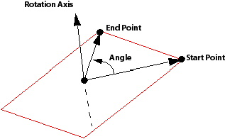 The Two Points option calculates an angle using the axis of rotation and the two points specified, as shown in the following figure. The two points and the start point of the axis define a plane with a normal direction pointing towards the end point of the axis. The angle proceeds in the clockwise direction from the Start to the End point when looking from the start point to the end point of the axis. When picking points from the viewer, the Show Faces render option must be selected to enable a point on a region to be picked. It may also be useful to have Snap to Node selected (on by default in the viewer toolbar).
