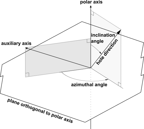Local Spherical AnglesYou must specify an Inclination Angle and an Azimuthal Angle, which are used within a local coordinate frame that is defined by Polar Axis and Auxiliary Axis direction vectors (which are not parallel). The hole direction is determined by rotating away from the local Polar Axis, towards the Auxiliary Axis, by the Inclination Angle, then further rotating around the local Polar Axis, in a direction consistent with the right-hand rule, by the Azimuthal Angle.