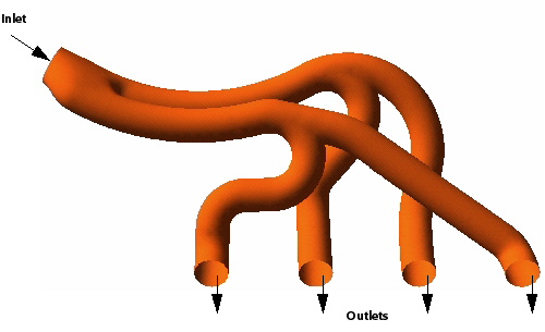 This example is a complex quantitative subroutine that takes slices through the manifold geometry, as shown below, compares the mass flow through the two sides of the initial branch, and computes the pressure drop through to the four exit locations.