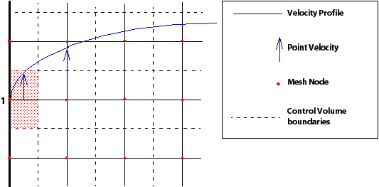 Using velocity as an example, the velocity value calculated at a mesh node is based upon the ‘average’ in the control volume surrounding that node. For calculation purposes, the entire control volume is then assumed to possess that velocity. At a boundary node, its surrounding control volume includes an area in the bulk of the fluid (this area is highlighted around the boundary node marked 1). Hence, the conservative velocity calculated at the wall node is not zero, but an ‘average’ over the control volume adjacent to the boundary. At a wall boundary node the difference between conservative and hybrid values can be illustrated by considering the case of the mass flow rate through the wall-adjacent control volume. If a zero velocity was enforced at the boundary node, then this would produce zero mass flow through the control volume, which is clearly not correct.