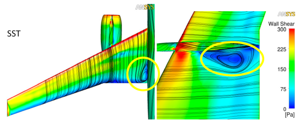wall resolution. An example of the SST model solution is shown in Figure 12.68: Comparison of wall shear stress coefficient, Cf (upper left), wall