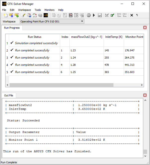 Note: For an operating point run that has been continued from a previous .mres file, the table in the run history page will show the previous values for input and output parameters – even if they have changed in the new run – until the operating point has been rerun. Absence of the run status for a given operating point means that the operating point has not yet been rerun and its values could change if it is rerun.