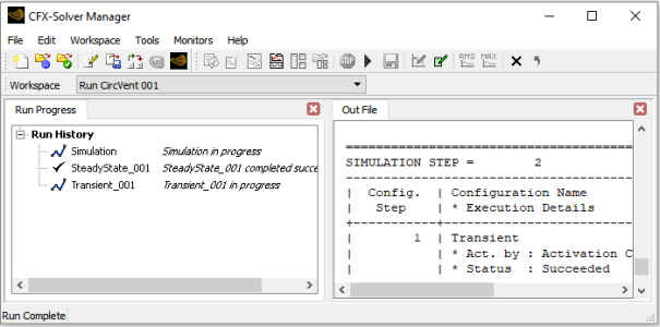 In this case, there are two simulation steps: a steady-state analysis and a transient analysis. The steady-state analysis (simulation step 1) is complete, and the transient analysis (simulation step 2) is in progress. Because the transient analysis is in progress, the overall simulation is marked as being in progress. When the transient analysis completes, the overall simulation will be marked as being complete.