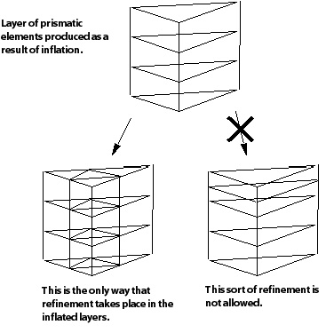In regions where inflation has taken place (so that there are prisms and some pyramid elements near wall boundary conditions), the mesh adaption avoids refining these elements in the direction perpendicular to the wall. Only edges on the interface between the inflated elements and the rest of the tetrahedral mesh are allowed to be marked for adaption. When the refinement of these edges takes place, the refinement propagates through the layers of prismatic elements to the wall boundary condition itself.