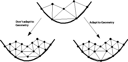 Mesh adaption in Ansys CFX does not have the capability of refining the surface mesh back to the original geometry. This means that nodes that are added to the surface of the problem are added onto the edges of the existing mesh rather than to the surfaces of the original geometry. An illustration of these two alternatives is shown below. Note that only the option shown on the left is available in Ansys CFX.