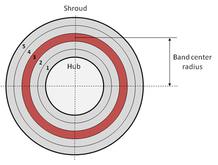 The radial equilibrium option divides the boundary condition into radially oriented circumferential bands. The pressure within each band is constrained by the radial equilibrium condition: