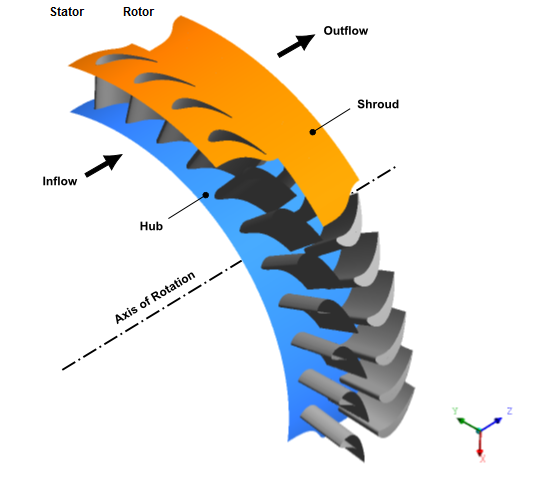 In this example, the rotor rotates about the Z axis at 3500 rev/min (positive rotation following the right hand rule) while the stator is stationary. Rotational periodicity boundaries are used to enable only a small section of the full geometry to be modeled.