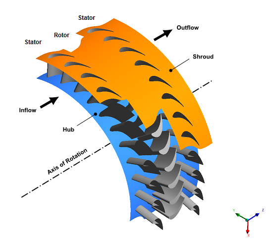 In this example, the rotor rotates about the Z axis at 3500 rev/min (positive rotation following the right hand rule) while the stator rows are stationary. Rotational periodicity boundaries are used to enable only a small section of the full geometry to be modeled.