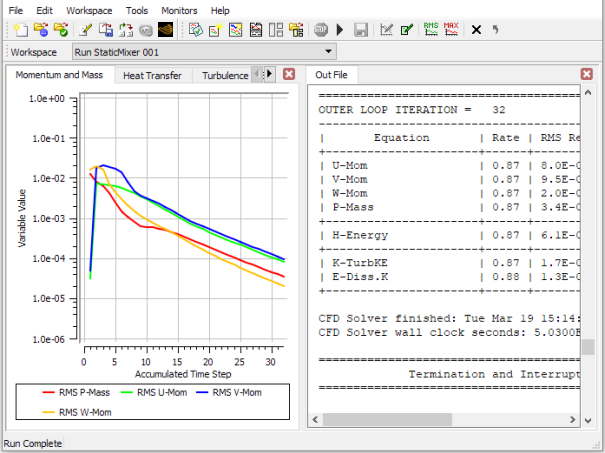 This tutorial simulates a static mixer consisting of two inlet pipes delivering water into a mixing vessel; the water exits through an outlet pipe. A general workflow is established for analyzing the flow of fluid into and out of a mixer.