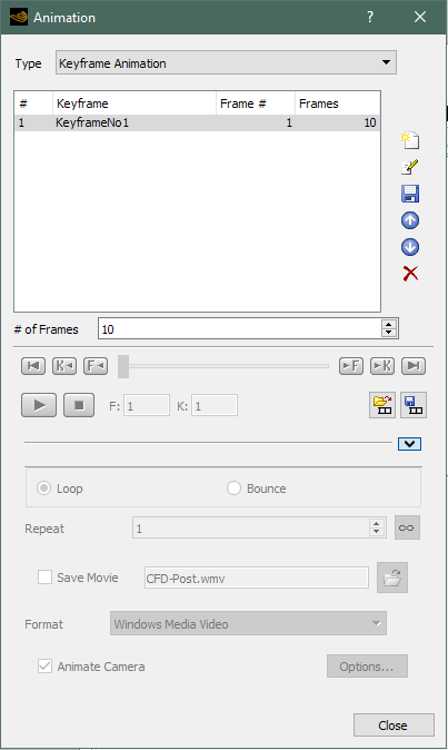 The Animation dialog box is used to define keyframes and to export to a video file.