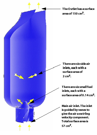 The can combustor is a feature of the gas turbine engine. Arranged around a central annulus, can combustors are designed to minimize emissions, burn very efficiently and keep wall temperatures as low as possible. This tutorial is designed to give a qualitative impression of the flow and temperature distributions inside a can combustor that burns methane in air. The basic geometry is shown below with a section of the outer wall cut away.