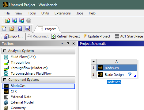 In the Toolbox view, expand Component Systems and double-click BladeGen.