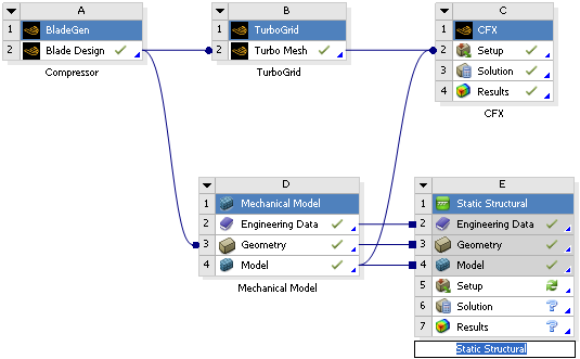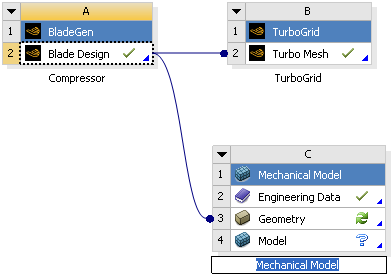 In the Project Schematic view, the Blade Design cell now displays a green check mark to indicate that the cell is up-to-date. This means that you now have a geometry for the centrifugal compressor that is ready to be used for meshing purposes.
