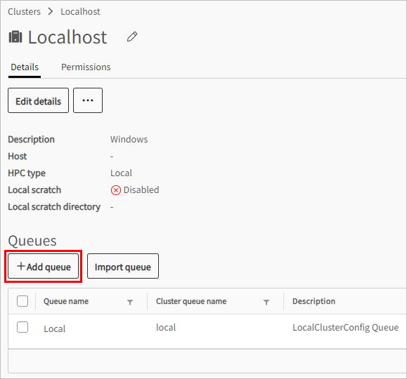 Open the cluster configuration to which you want to add a queue. Click the cluster name, or in the Actions cell of the cluster, click and select .