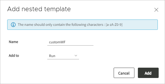 Add nested template.Specify a name and target location for the nested workflow within the tree: