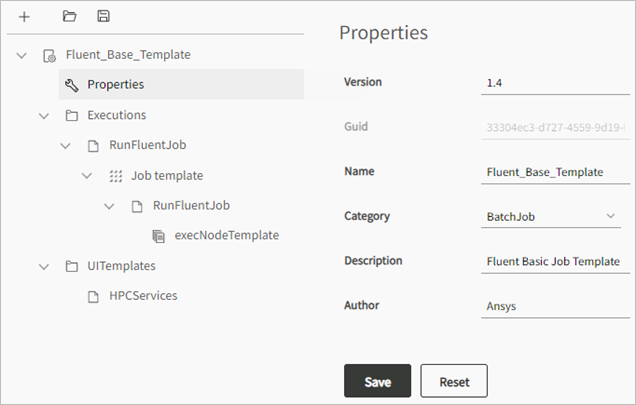 To edit the system properties of the template (name, version, and so on), select Properties in the template tree.