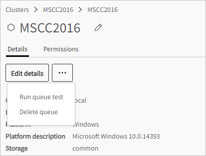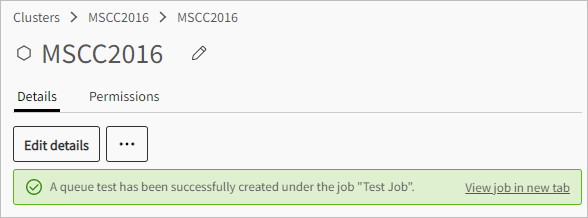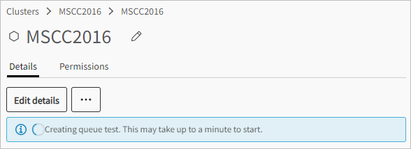Open the cluster configuration containing the queue to be tested. Click the cluster name, or in the Actions cell of the cluster, click and select .