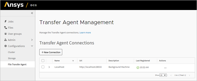 The File Transfer Agent page enables you to create connections between the file transfer agent and remote servers, monitor the status of connections, reconnect the agent when a connection is lost, and delete connections.