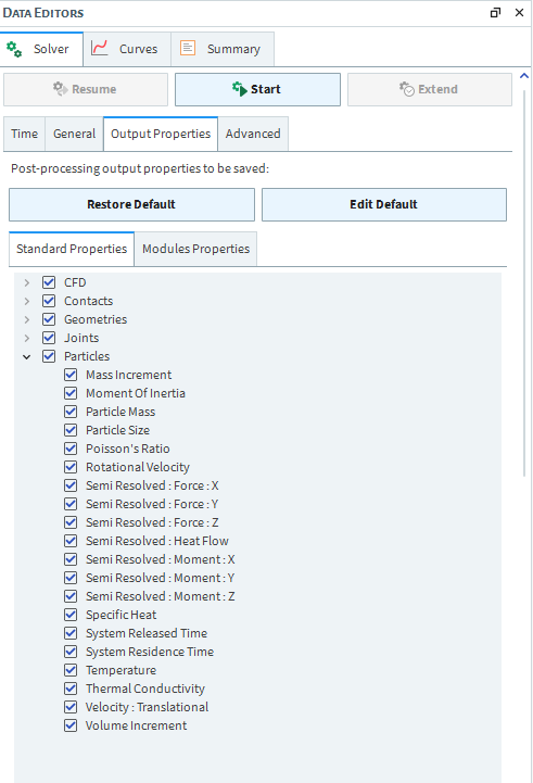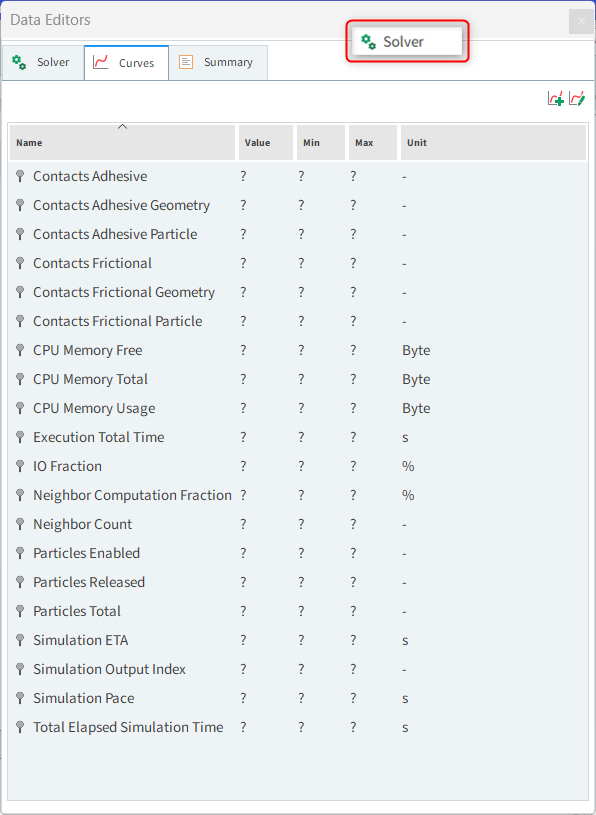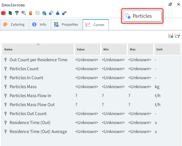 Particles and Solver each contain a Curves tab, which includes several pre-defined curves that can be plotted without applying any additional operations.