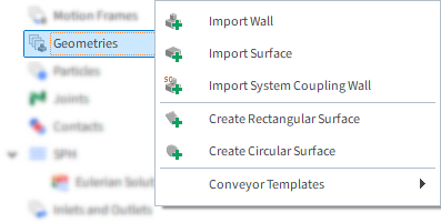 The Geometries step enables you to add default geometries, such as conveyors or surfaces, or import your own custom geometries (walls or surfaces).