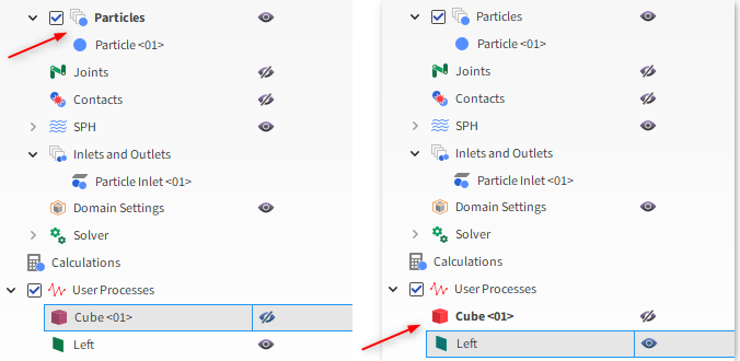 For example, when you select Cube <01>, Particles will be displayed in bold letters. And when you select the Left plane, Cube <01> will be bold.