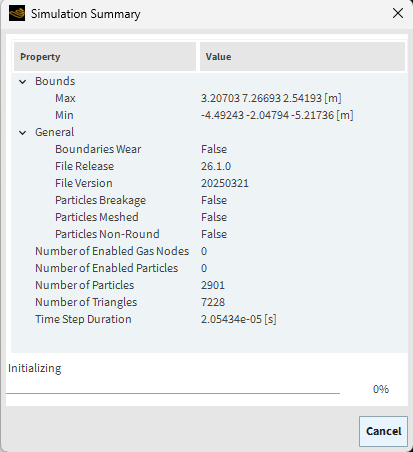 After saving the project, a Rocky dialog is displayed, where geometry limits (in X, Y and Z directions) are shown.