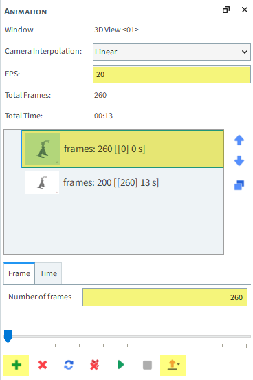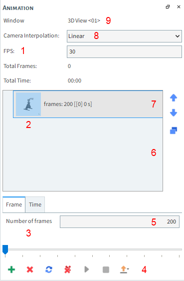 (5) Number of frames between the selected Key Frame and the next one. The Number of Frames divided by the FPS gives the real animation time. This value can be changed to display the animation in real time.