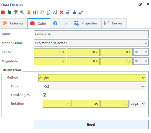 2. From the Data Editors panel, in the Cube tab, use the values shown in the image for Center, Magnitude, Method, and Rotation.