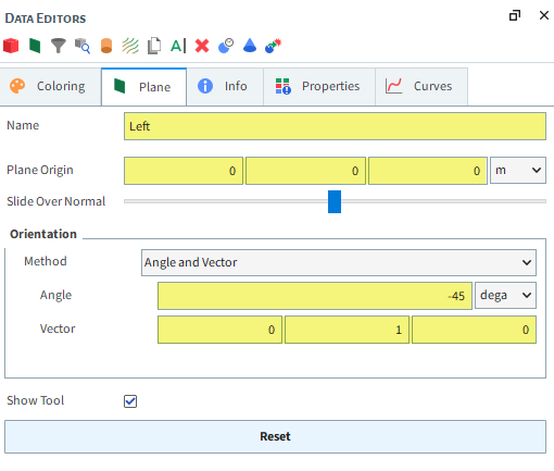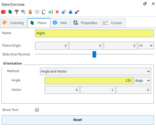 2. From the Data Editors panel, select the Plane tab and then modify the Name and Plane Orientation | Angle value.