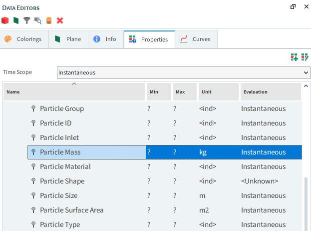 3. From the Data Editors panel, select the Properties tab, and then drag and drop Particle Mass over the plot.