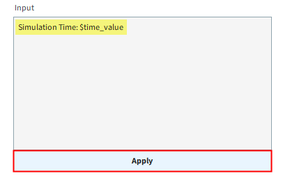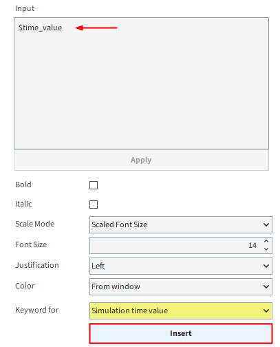 We are going to add a dynamic value for Simulation Time. Click Keyword for and select Simulation Time. Click Insert. The placeholder text appears in the Input box.