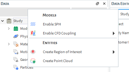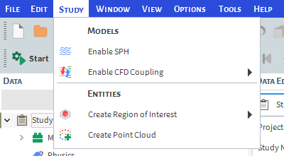 Aternatively, CFD Coupling options, Regions of Interest and Point Clouds are also enabled from the main Study menu: