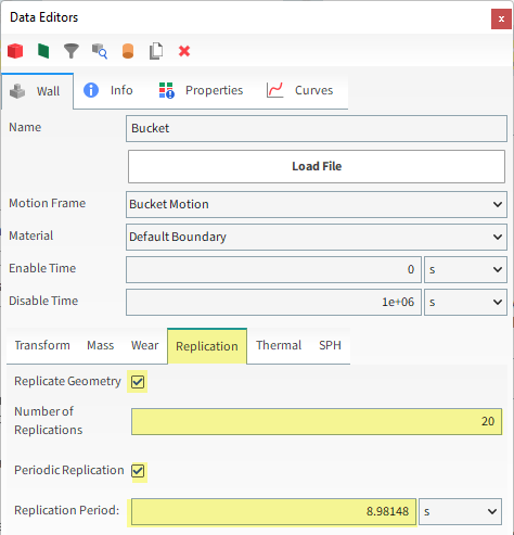 For this tutorial, the Replicate Geometry option will be activated for the Bucket geometry, which will create copies of the geometry (and its assigned motions) at specified intervals along the motion's path.