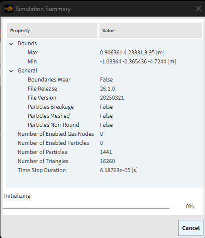 Particle | Size Add size row (x1) (1) Size | Cumulative % 0.15 [m] @ 100 [%] (2) ... 0.05 [m] @ 10 [%] Particle | Movement Rolling Resistance 0.4 [ - ]