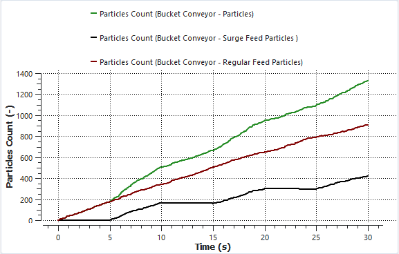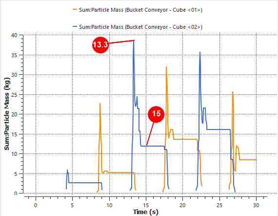 Note that when crossing the Hopper (at 13.3 s for example), the cubes encompass particles that are not necessarily being carried by the buckets, and it causes peaks on the plot.