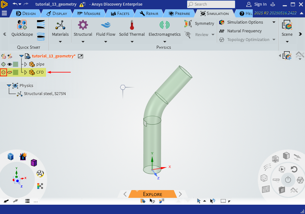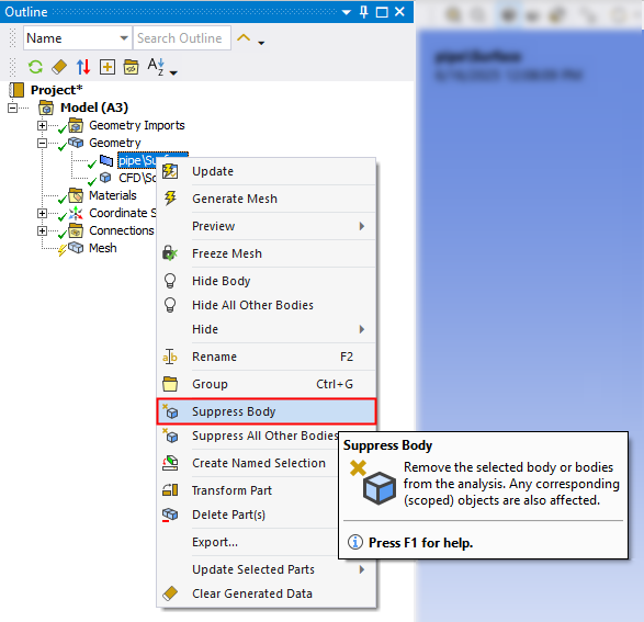 From the Outline panel, under Model | Geometry, right-click pipe\Surface, and then click Suppress Body.
