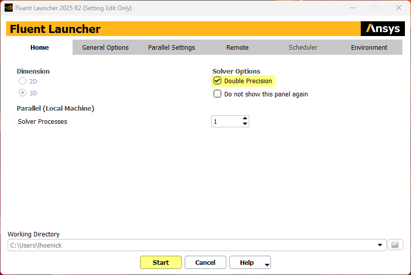From the Fluent Launcher dialog that appears, select Double Precision (as shown), ensure 3D is selected for Dimension, and then click Start.
