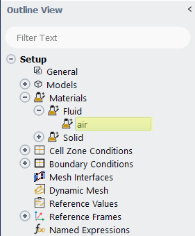 From the Outline View tree panel, under Setup | Materials | Fluid, double-click air.
