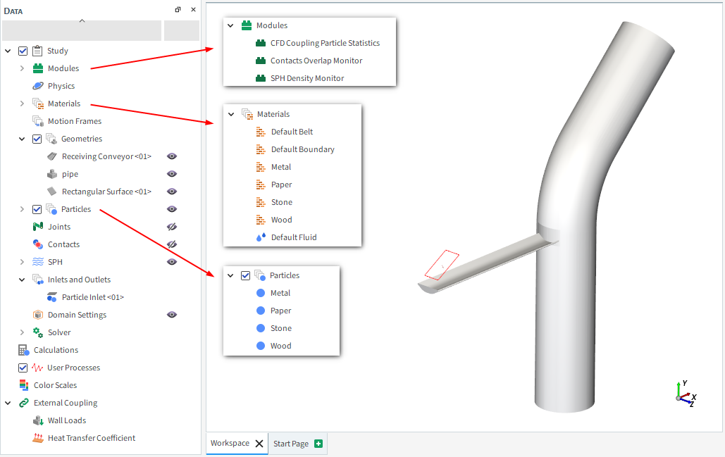 To better visualize the particles we are analyzing, use the eye icons on the Data panel to hide Particles and every entity under User Processes except the Metal Smalls and Stone Smalls entities.