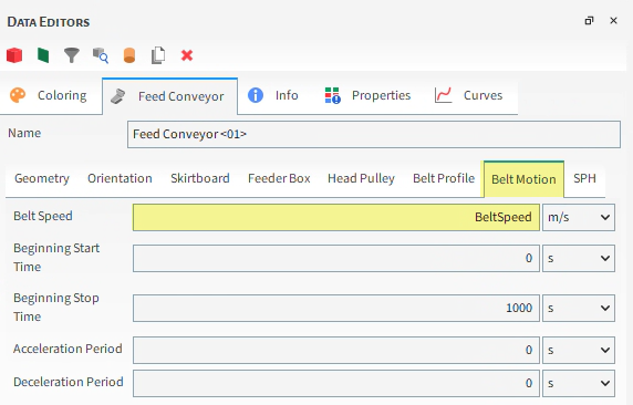 Under Input Parameters, you can adjust the BeltSpeed of the Feed Conveyor we set up in Part A in Rocky (shown in green).