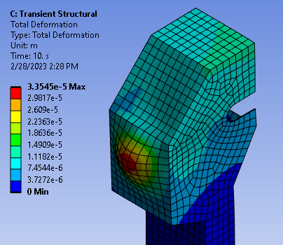 This completes Part B of this tutorial, in which through Ansys Workbench / Ansys Transient Structural - Mechanical was used to set up and run a FEA simulation using the particle forces calculated previously by Rocky.